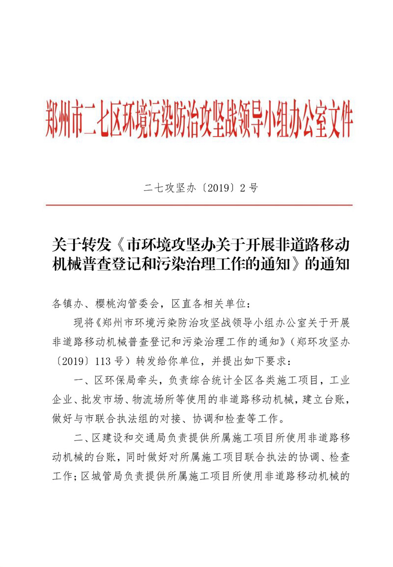 關(guān)于轉(zhuǎn)發(fā)《市環(huán)境攻堅(jiān)辦關(guān)于開展非道路移動(dòng)機(jī)械普查登記和污染治理工作的通知》的通知