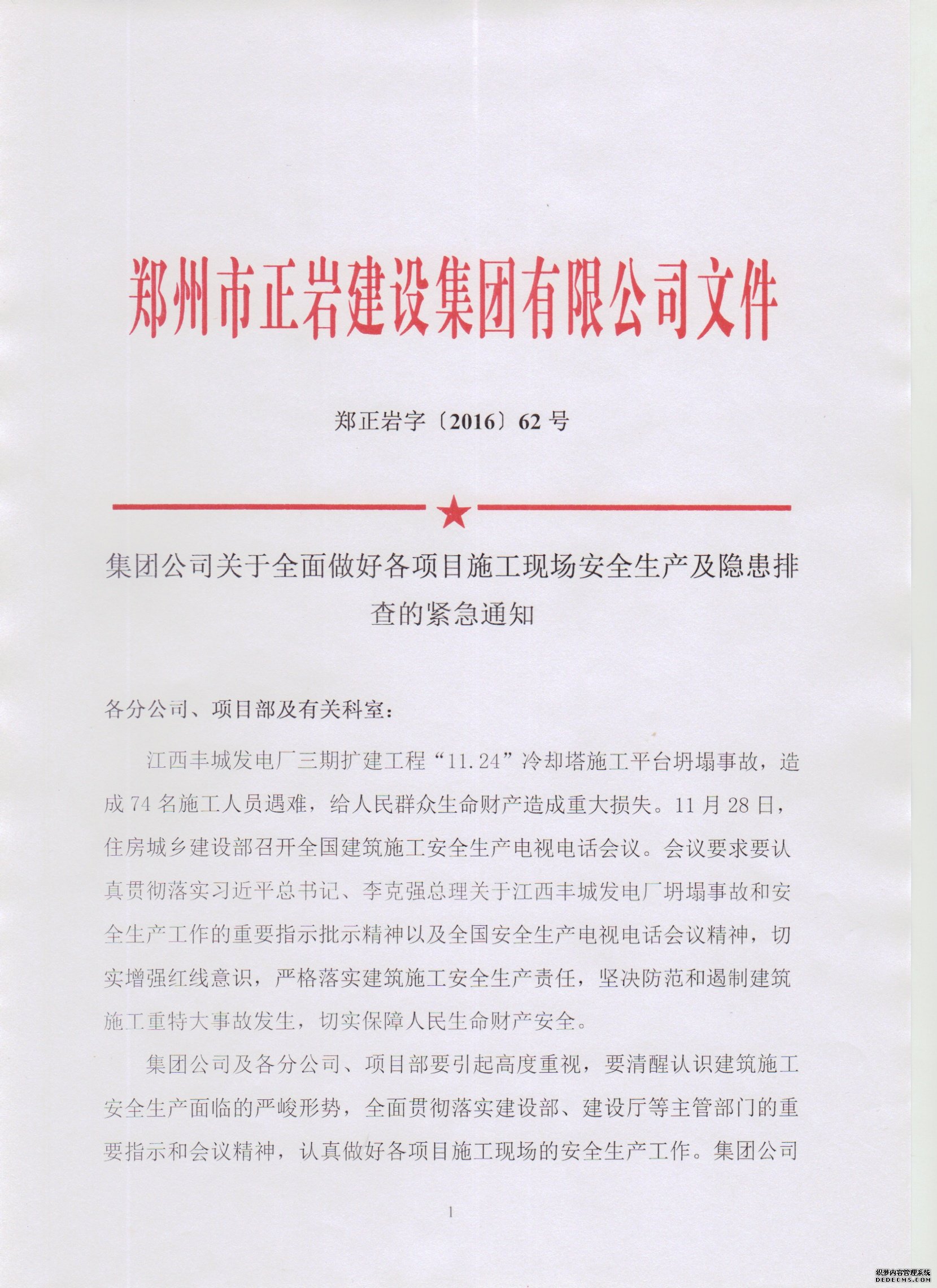鄭正巖字〔2016〕62號 集團(tuán)公司關(guān)于全面做好各項目施工現(xiàn)場安全生產(chǎn)及隱患排查的緊急通知