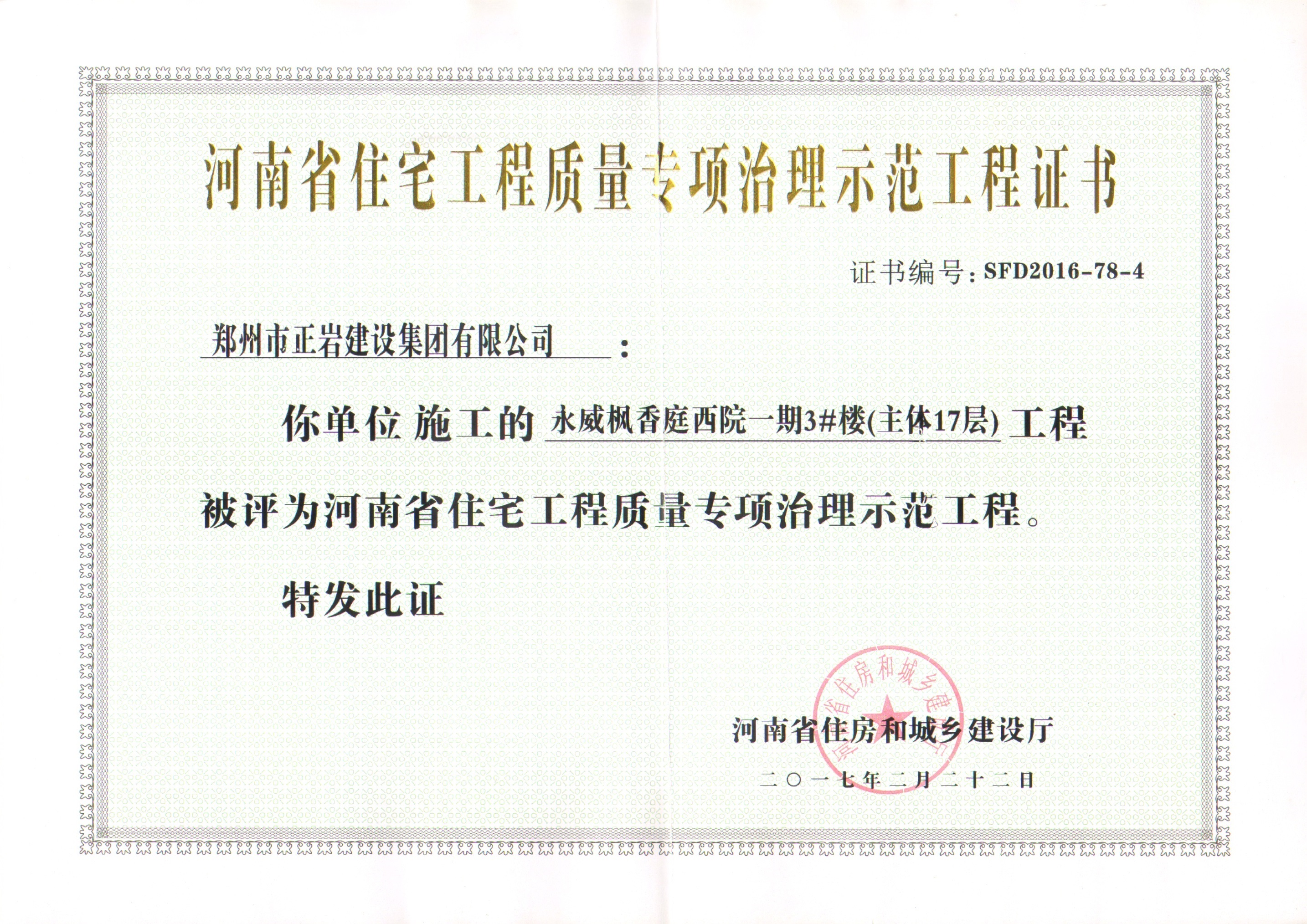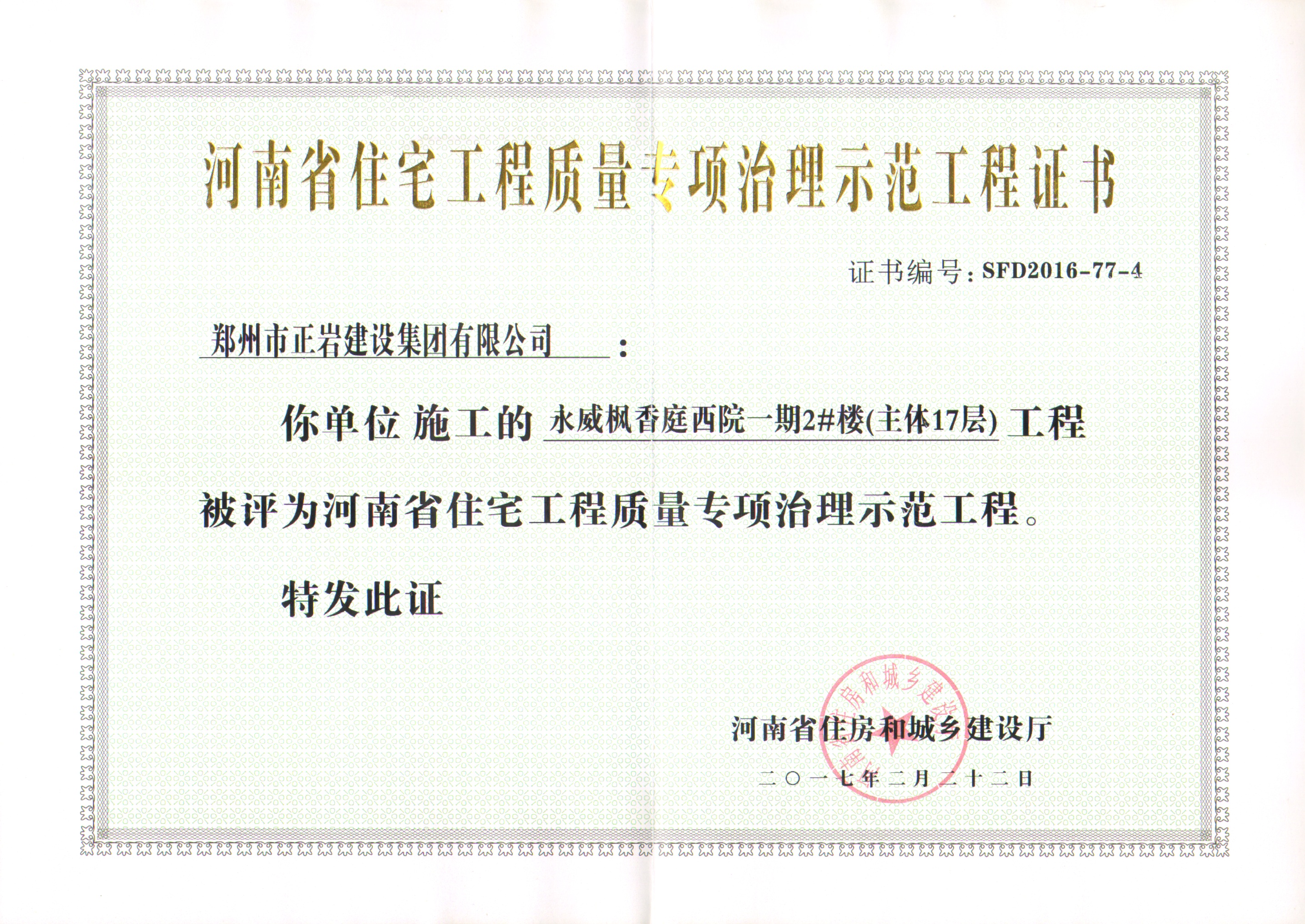 祝賀永威楓香庭西院一期項(xiàng)目榮獲“河南省住宅工程質(zhì)量專項(xiàng)治理示范工程”獎(jiǎng)