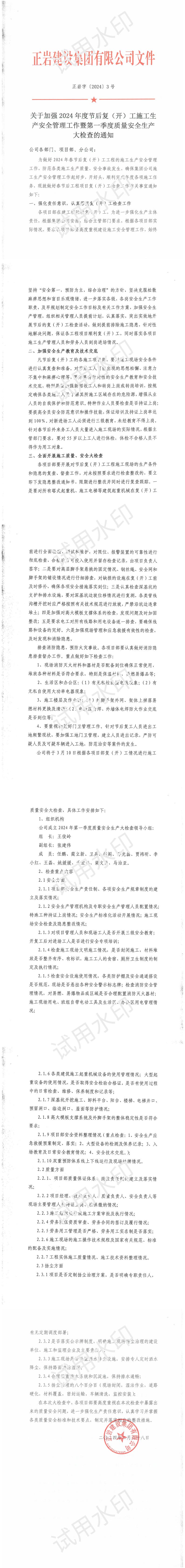 上一篇:正巖字[2023]19號(hào)關(guān)于正巖集團(tuán)夏季安全文明施工的通知 下一篇:關(guān)于加強(qiáng)2024年度節(jié)后復(fù)(開)工施工安全管理工作暨第一季度質(zhì)量安全生產(chǎn)大檢查的通知