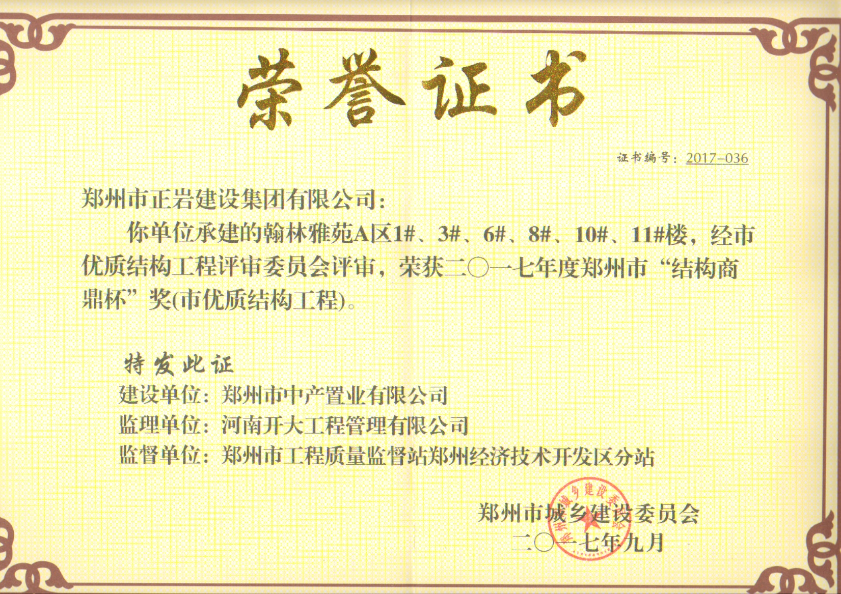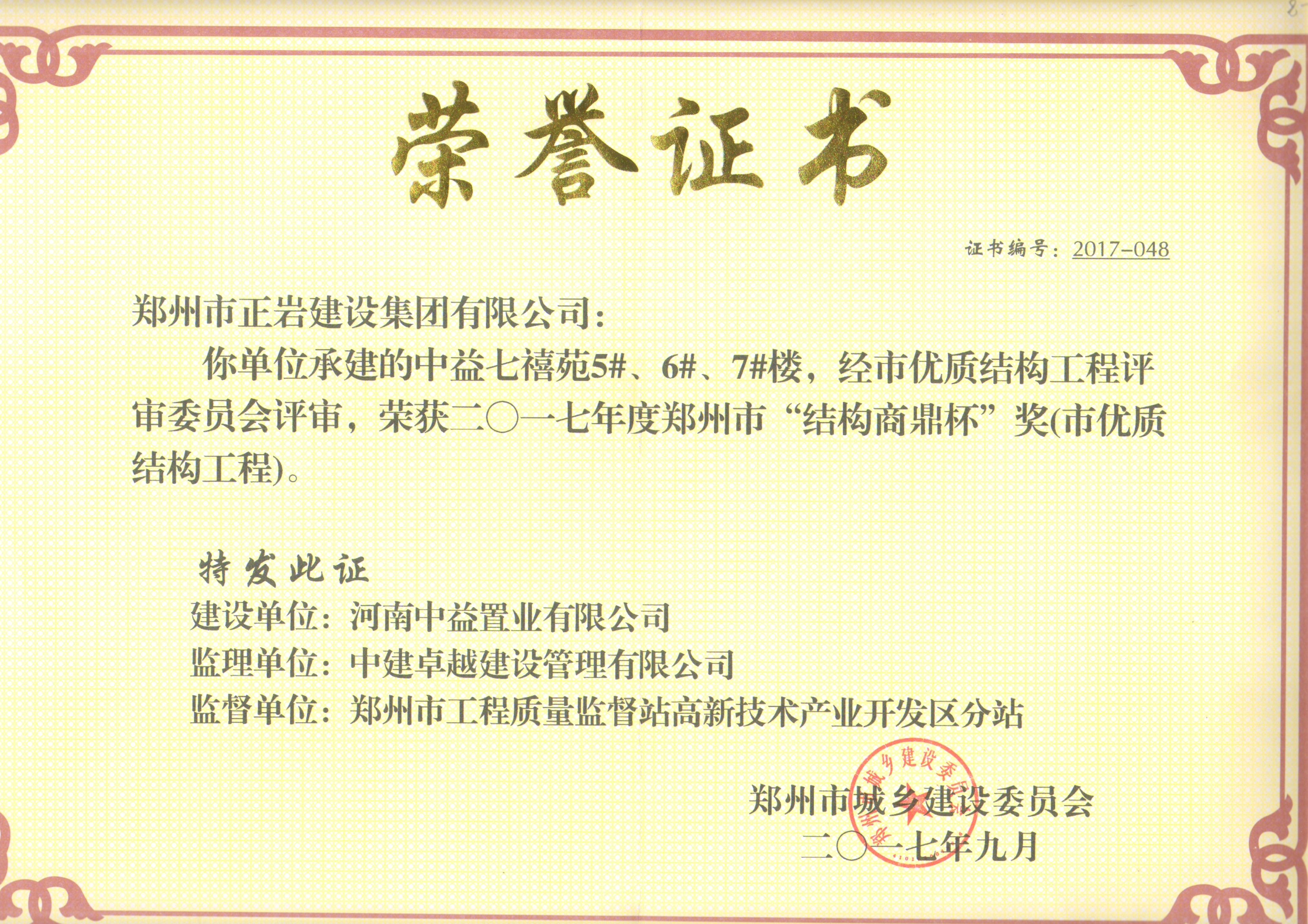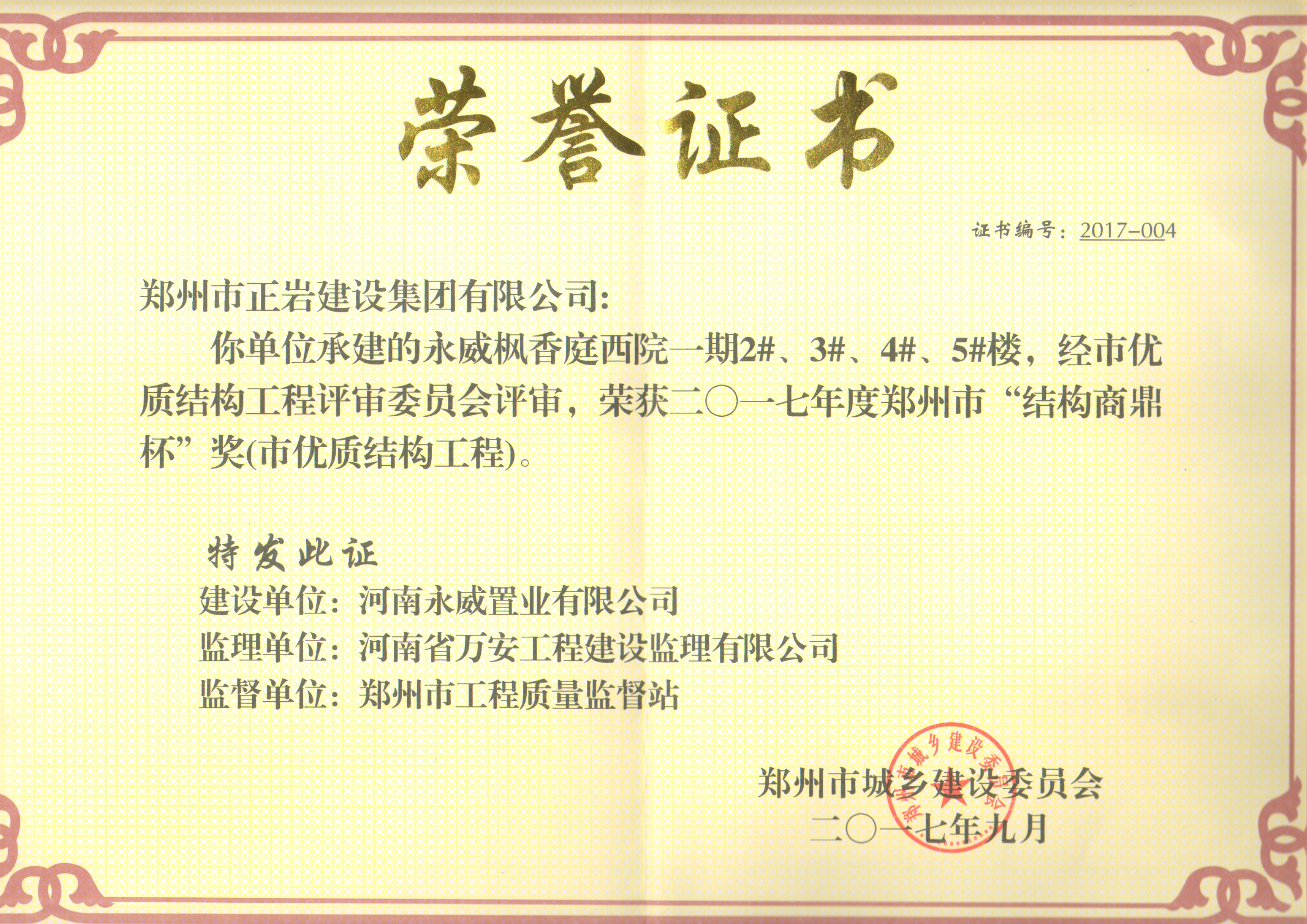祝賀永威楓香庭西院一期、翰林雅苑A區(qū)、中益七禧苑項目榮獲鄭州市“結(jié)構(gòu)商鼎杯”獎(市優(yōu)